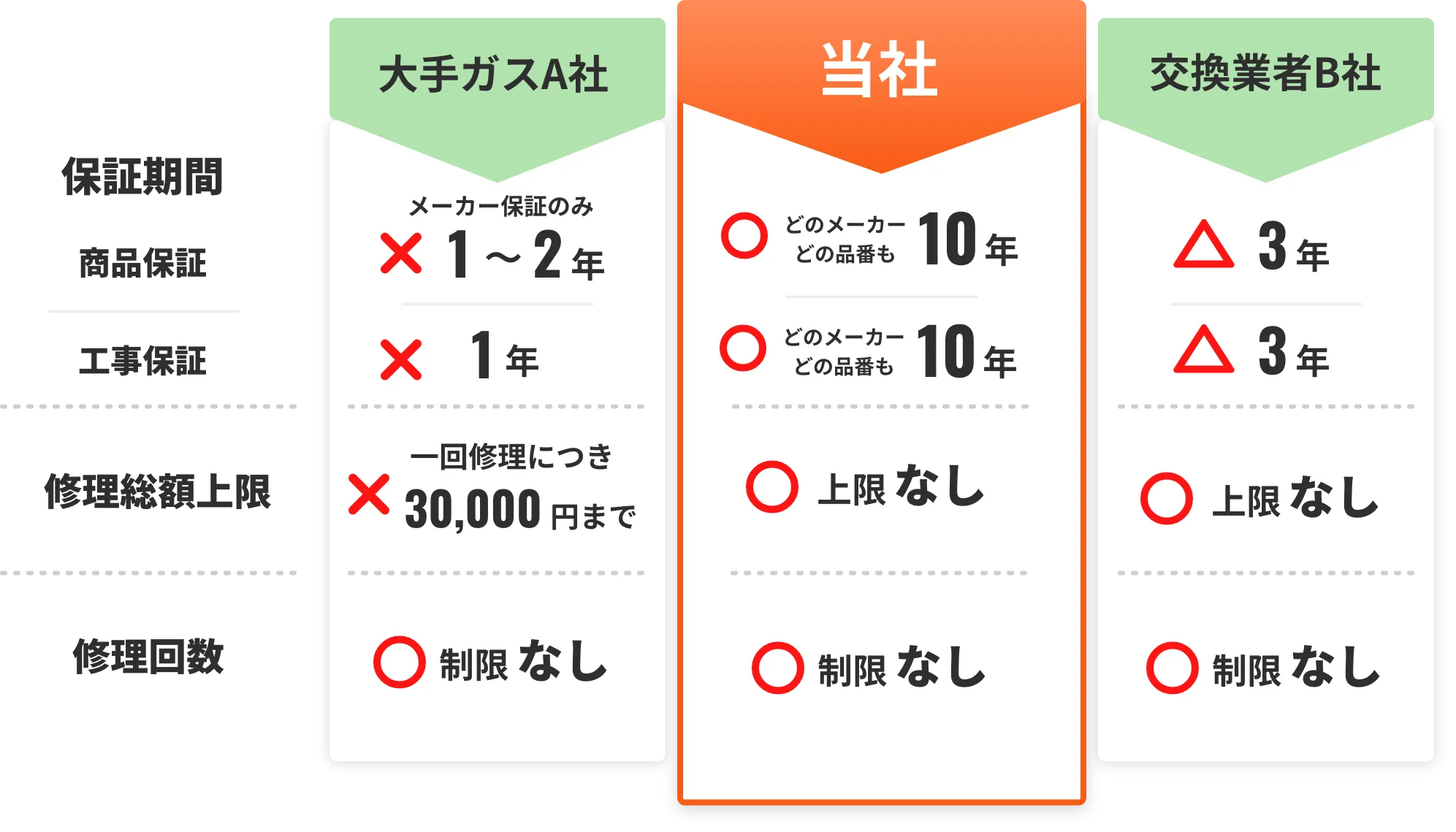 保証が付いていない会社・保証期間が短い会社ですと数年しか使っていないのにまた買い替えなどさらに料金がかかってしまうことも…